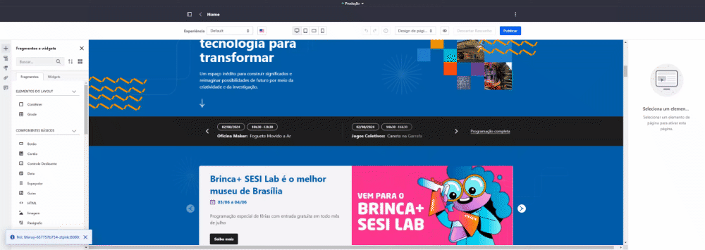 Observação: Para acessar os elementos editáveis, basta entrar no modo de edição de página pelo painel de controle e clicar nos elementos que deseja alterar.